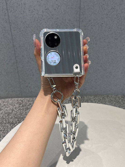 Luxury Makeup Mirror For Huawei P50 Pocket With Silver Wrinkle Holder And Bracelet Chain