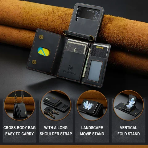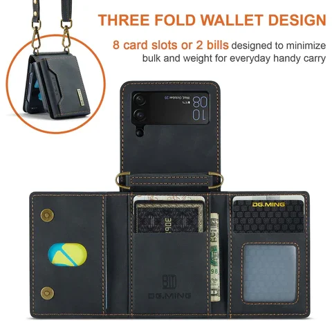 Designed specifically for the Samsung Galaxy Z Flip 3/4/5 5G, this phone case boasts 8 card slots, perfect for holding IDs, debit cards, credit cards, and more. The wallet feature of the Galaxy Z Flip 3/4/5 case is easily manageable with just one hand, folding smoothly without any delay. With its 2-in-1 detachable design, the slim case and wallet can be separated or attached using a strong magnetic connection. This offers both features in a single, versatile option, providing distinct and convenient usage.