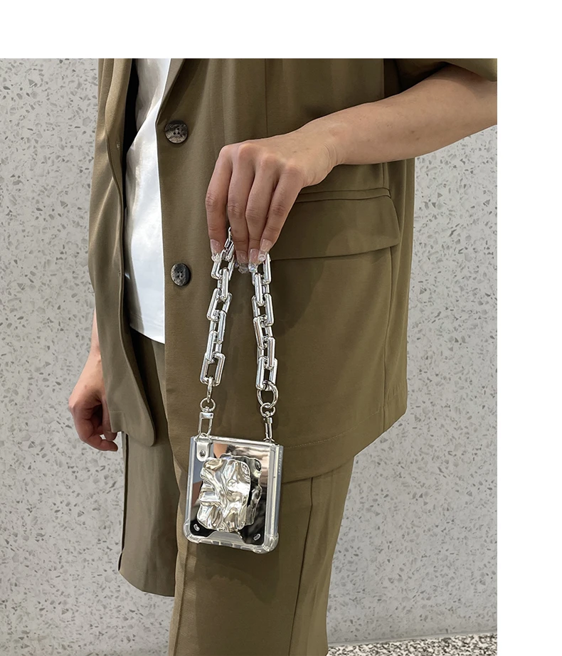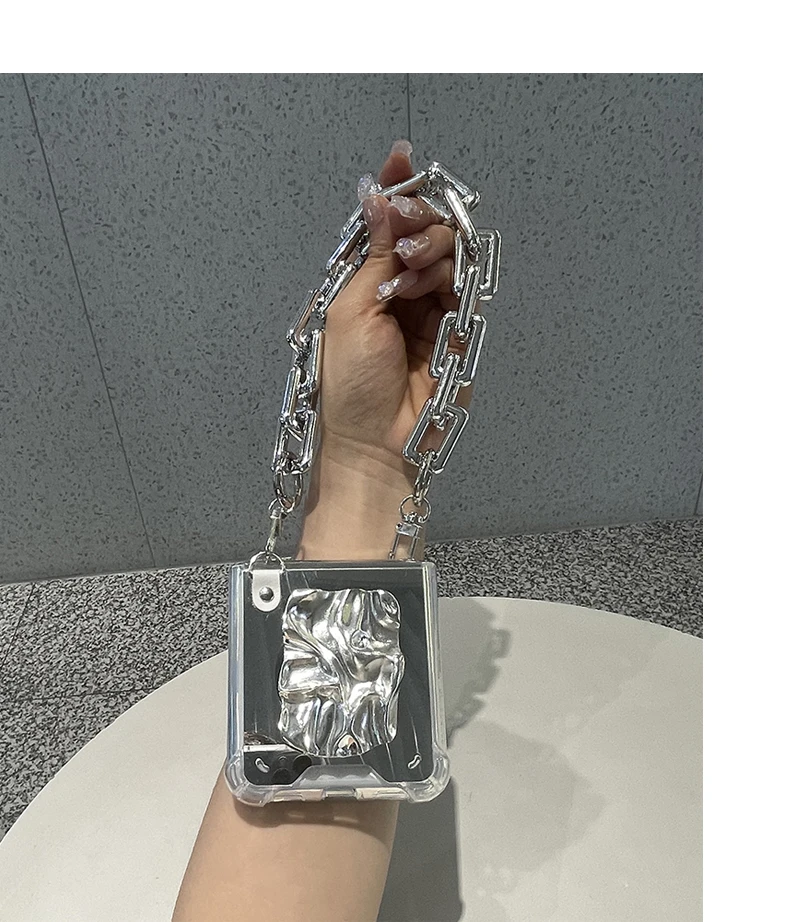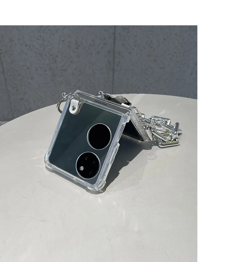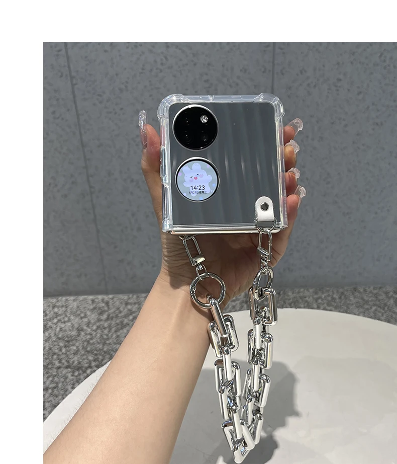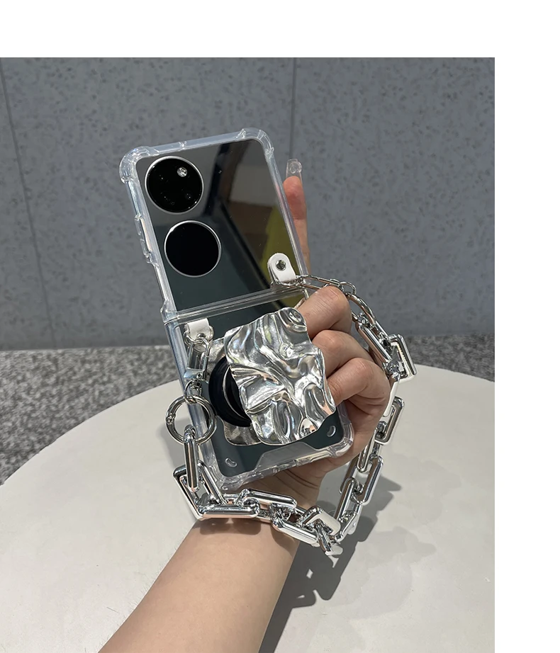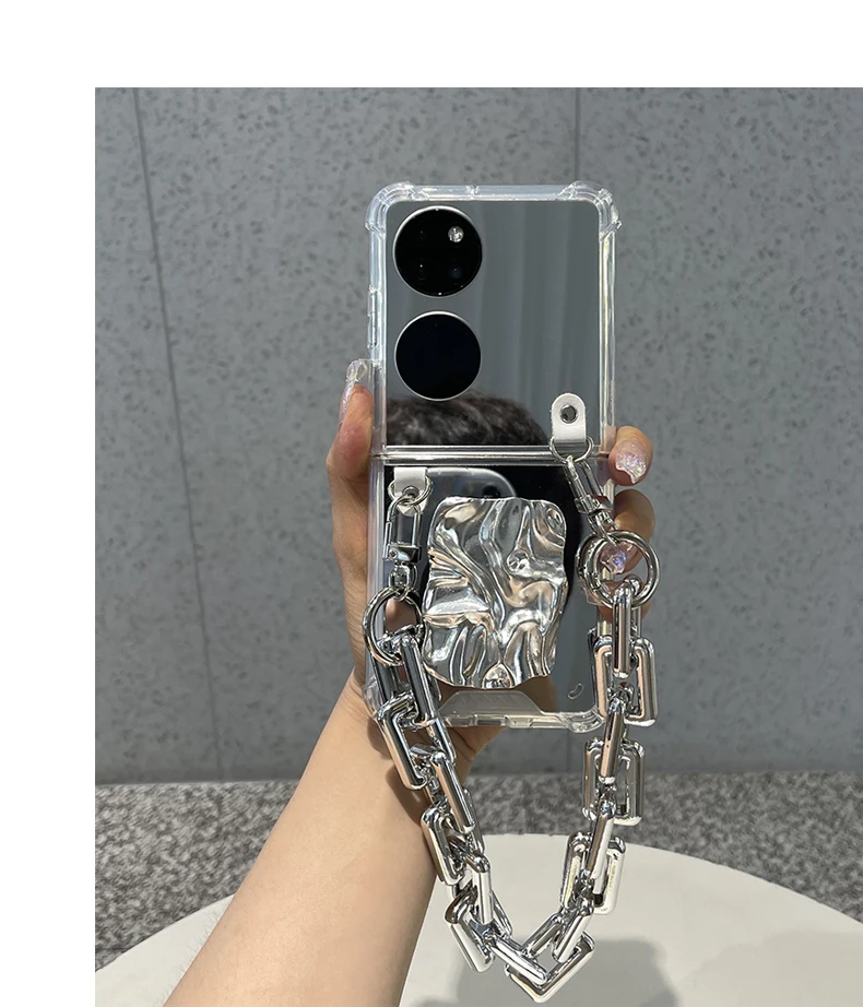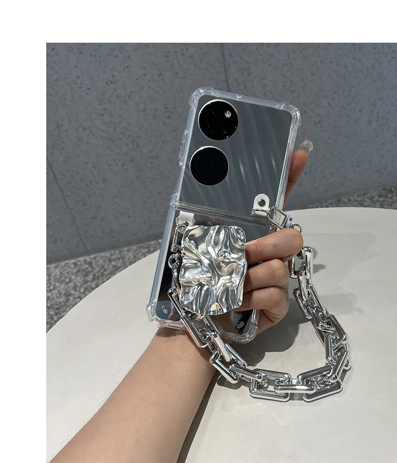 Luxury Makeup Mirror For Huawei P50 Pocket With Silver Wrinkle Holder And Bracelet Chain